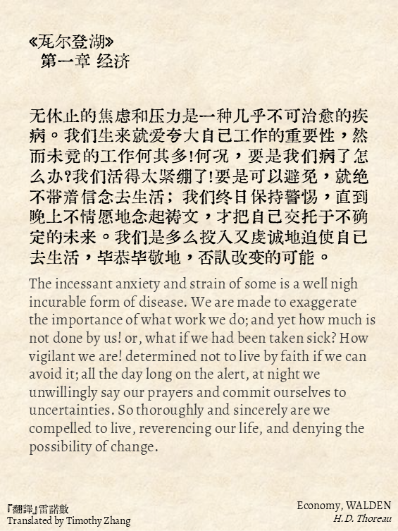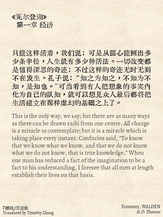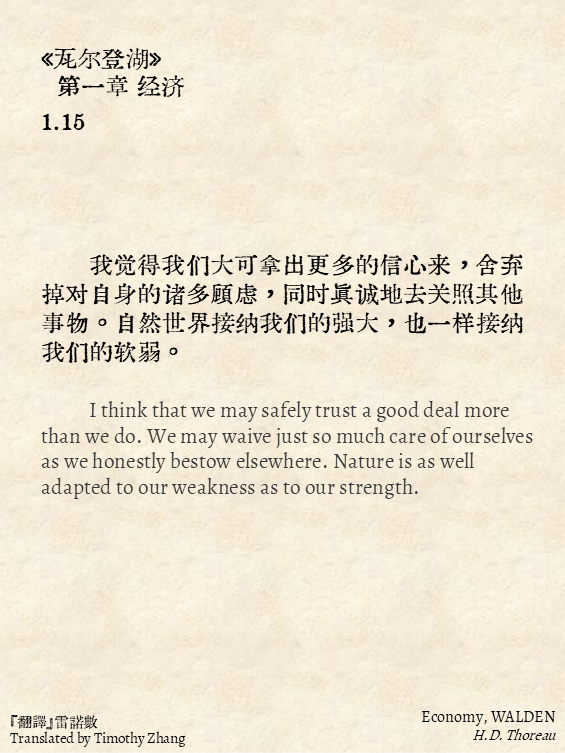 我觉得我们大可拿出更多的信心来,舍弃掉对自身的诸多顾虑,同时真诚地去关照其他事物。自然世界接纳我们的强大,也一样接纳我们的软弱。无休止的焦虑和压力是一种几乎不可治愈的疾病。我们生来就爱夸大自己工作的重要性,然而未竟的工作何其多!何况,要是我们病了怎么办?我们活得太紧绷了!要是可以避免,就绝不带着信念去生活;我们终日保持警惕,直到晚上不情愿地念起祷文,才把自己交托于不确定的未来。我们是多么投入又虔诚地迫使自己去生活,毕恭毕敬地,否认改变的可能。只能这样活着,我们说;可是从圆心能画出多少条半径,人生就有多少种活法。一切改变都是值得深思的奇迹;不过这样的奇迹无时无刻不在发生。孔子说:“知之为知之,不知为不知,是知也。”可当看到有人把想象的事实内化为自己的认知,就可以想见众人最后都将把生活建立在那样虚幻的基础之上了。