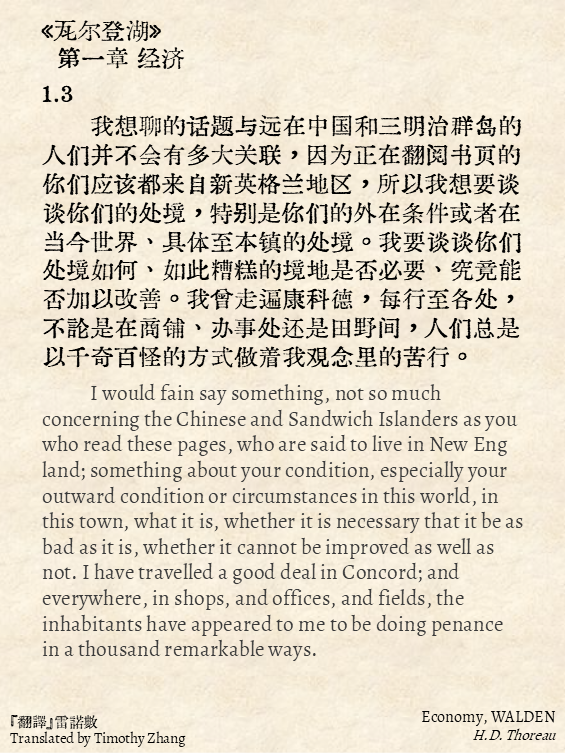 我想聊的话题与远在中国和三明治群岛1的人们并不会有多大关联,因为正在翻阅书页的你们应该都来自新英格兰地区,所以我想要谈谈你们的处境,特别是你们的外在条件或者在当今世界、具体至本镇的处境。我要谈谈你们处境如何、如此糟糕的境地是否必要、究竟能否加以改善。我曾走遍康科德,每行至各处,不论是在商铺、办事处还是田野间,人们总是以千奇百怪的方式做着我观念里的苦行。我听说有的婆罗门会四面烤火,坐着仰视太阳;有的将身体倒悬,头颅朝下,接受火焰炙烤;有的回首凝视天空“直到他们再也无法恢复自然的姿势,只有液体可以穿过扭曲的脖子抵达胃部”;有的待在树下,在链条束缚下度过余生;有的像毛虫一样,用自己的身躯丈量广袤的国土;还有的单脚站立在柱子上——即使是这样有意为之的苦行2,也远不及我每日之所见匪夷所思、震撼人心。与我邻里乡亲所承担的辛劳相比,赫拉克勒斯的十二项试炼都显得微不足道。毕竟大力神面对的试炼只有十二项,且总有尽时。可我从未见过乡亲们杀死或捕获什么怪物,也未见他们真正做完任何活计。他们没有伊俄拉俄斯这样的朋友帮忙灼烧海德拉的断颈,于是刚砍掉一个,两个新头便冒了出来。3