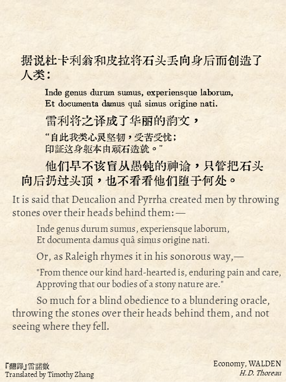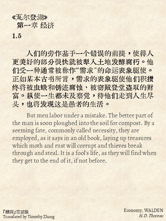 人们的劳作基于一个错误的前提,使得一个人更美好的那部分1很快就被犁入了土地腐朽发酵。他们受一种通常被称作“需求”的命运表象驱使。2正如某本古书3所言,需求的表象驱使他们积攒终将被虫蛾和锈迹腐蚀、被窃贼登堂盗取的财富。纵使一生都未及察觉,待他们走到人生尽头,也将发现这是愚者的生活。据说杜卡利翁和皮拉4将石头丢向身后而创造了人类:——